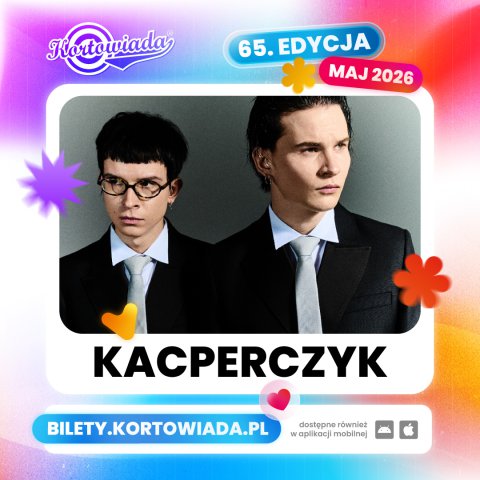 Dziś organizatorzy odkrywają kolejną kartę i ogłaszają powrót dobrze znanego kortowiadowej publiczności duetu Kacperczyk. Zadebiutowali w 2020 roku, a obecnie mają na koncie już kilka albumów oraz setki zagranych koncertów, które gromadzą wierne grono fanów. Ich najnowsza płyta, Wszyscy jesteśmy Kacperczyk, ukazała się w październiku 2025 roku i spotkała się z bardzo dobrym odbiorem słuchaczy.