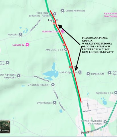 Inwestycja miałaby powstać w ciągu drogi krajowej nr 51. W Dywitach nowa droga dla pieszych i rowerzystów zaczynałaby się przy ul. Sosnowej i wiodła aż do skrzyżowania krajówki z ul. Jastrzębią w Ługwałdzie. W sumie to 1,7 km ścieżki.