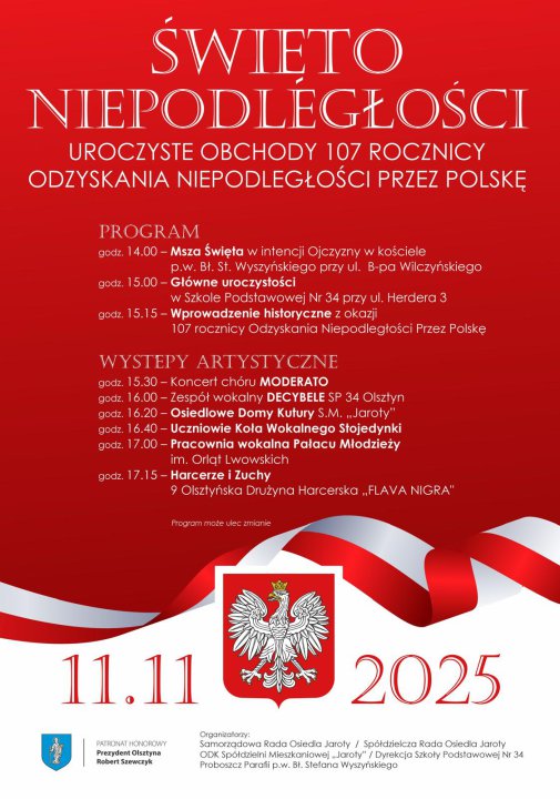Uroczyste obchody zaplanowała także Samorządowa i Spółdzielcza Rada Osiedla Jaroty. Przedsięwzięcie zostało objęte patronatem honorowym prezydenta Olsztyna, Roberta Szewczyka. Poniżej przedstawiamy program przedsięwzięcia, które rozpocznie się o godzinie 14:00: