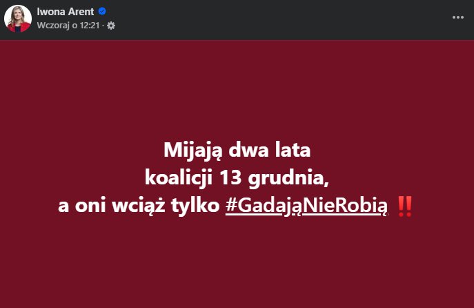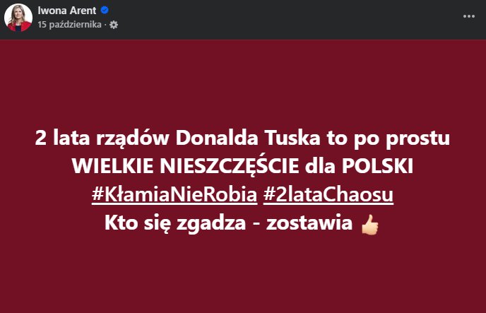 To nie pierwszy raz, kiedy Arent krytycznie oceniła okres rządów Donalda Tuska. Dnia 15 października – w drugą rocznicę wyborów parlamentarnych z 2023 roku - w przestrzeni jej Facebooka pojawiły się podobne treści.