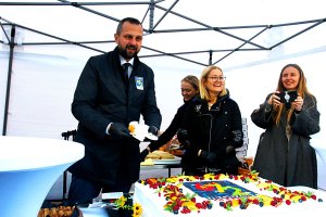 Kulminacyjnym momentem niedzielnych obchodów były: urodzinowy tort i kawa, które wręczał gościom prezydent Olsztyna, Robert Szewczyk.