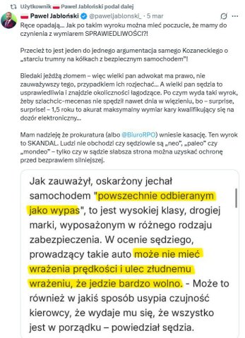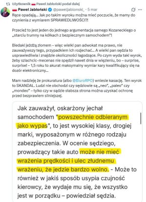 Marcowy wyrok mimo upływu czasu nadal jest szeroko komentowany w sieci. Obniżenie kary do 1 roku i 6 miesięcy umożliwia skazanemu skorzystanie z systemu dozoru elektronicznego zamiast więzienia (wystarczyło, żeby wyrok wydano na 1 rok i 7 miesięcy, aby takiej możliwości nie było). - Zakład, że nie pójdzie za kraty? - tak na platformie X napisał o decyzji olsztyńskiego sądu Łukasz Zboralski, redaktor naczelny serwisu BRD24.pl.