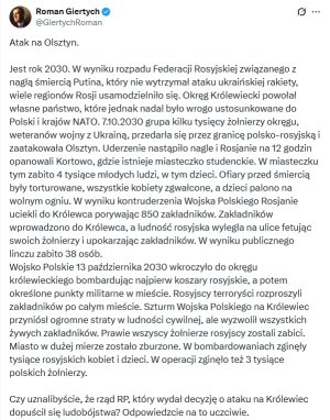 Wpis kończy apel do Czytelników, aby „uczciwie” odpowiedzieli sobie na pytanie, czy w przedstawionej historii działania polskiego rządu, który wydał decyzję ataku na Królewiec, uznaliby za ludobójstwo? (pełny wpis niżej).