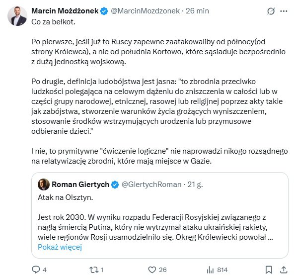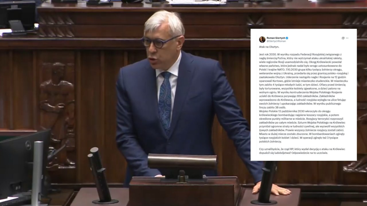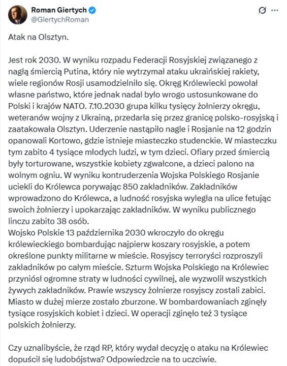 Na platformie X opublikował on wpis, w którym - per analogiam - przedstawia działania odwetowe Izraela. Jako Hamas w historii posła występuje Okręg Królewiecki, który brutalnie zaatakował Olsztyn (w domyśle: jedno z miast Izraela). Brutalna, w opowieści posła, była też odpowiedź Wojska Polskiego.