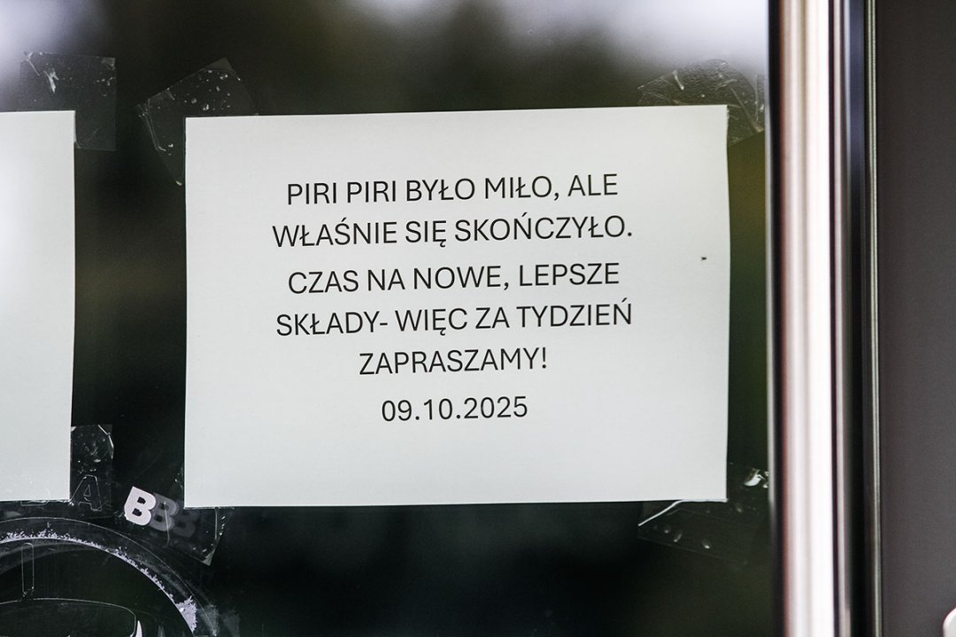 Od kilku dni Piri Piri w Olsztynie jest jednak zamknięte. Na drzwiach do restauracji gości wita napis o następującej treści: