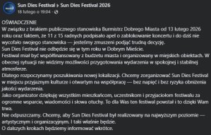 - Festiwal miał być współfinansowany z budżetu miasta i organizowany w miejskich obiektach. W obecnej sytuacji nie widzimy możliwości przygotowania wydarzenia w spokojnej i stabilnej atmosferze. Dlatego rozpoczynamy poszukiwania nowej lokalizacji. Chcemy zorganizować Sun Dies Festival w miejscu przyjaznym kulturze i otwartym na współpracę – bez napięć i bez ryzyka obniżenia jakości wydarzenia – napisano w oświadczeniu.