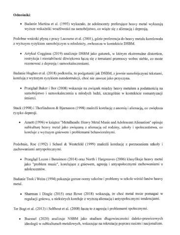 - Black metal, zwłaszcza w swoich ekstremalnych odmianach (…) często zawiera teksty gloryfikujące nihilizm, satanizm, przemoc, samobójstwo, samookaleczanie, nienawiść do chrześcijaństwa, rasizm lub supremację siły. W latach 90. norweska scena black metalowa (m.in. Mayhem, Burzum, Gorgoroth) była bezpośrednio związana z paleniem kościołów, morderstwami i samobójstwami – te wydarzenia do dziś stanowią symboliczny „mit założycielski” gatunku i budzą moralne oburzenie – tłumaczą.