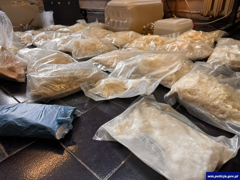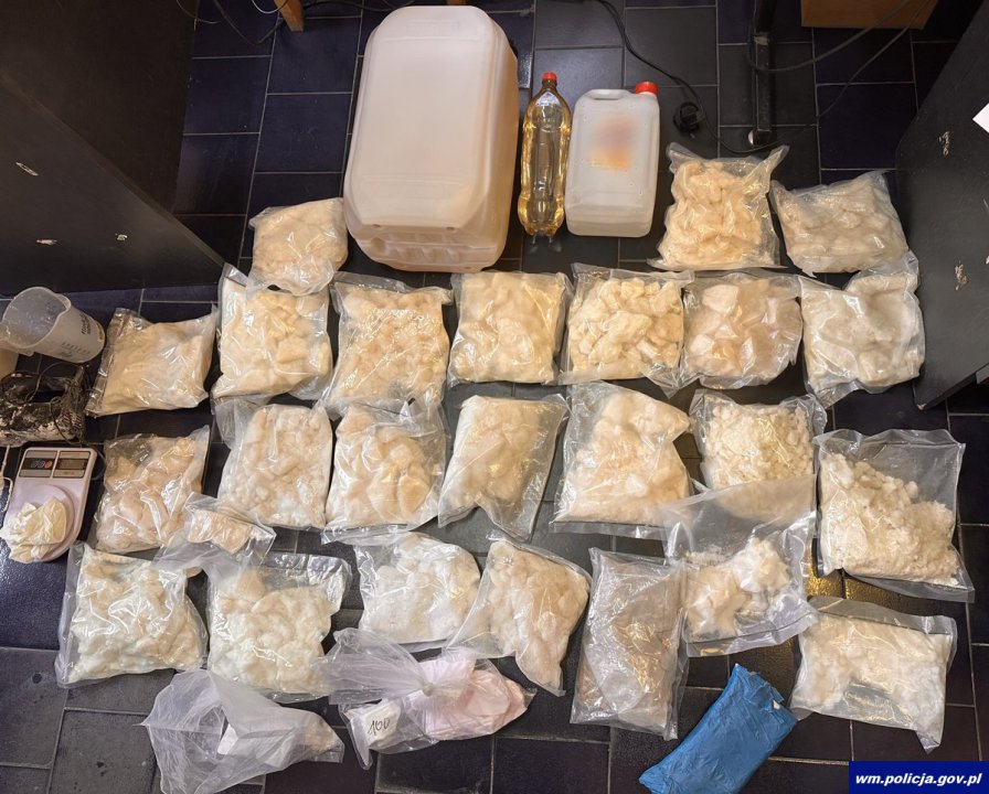 W trakcie przeszukania policjanci znaleźli worki z zawartością białego proszku, zbrylonych substancji czy pojemniki z płynem. Według wstępnych ustaleń zabezpieczono ponad 50 kilogramów narkotyków, w tym kokainę, amfetaminę, mefedron, marihuanę, haszysz, płynną substancję do produkcji zakazanych środków.