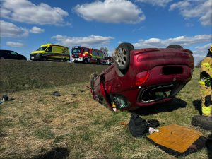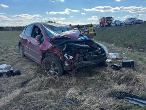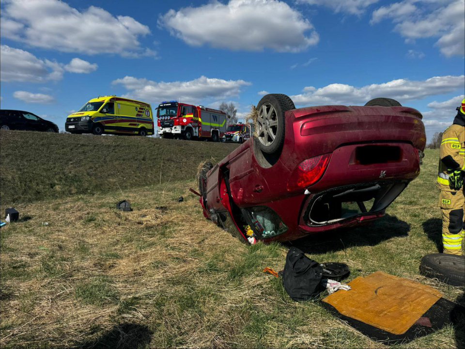 Kobieta, aby uniknąć zderzenia czołowego, zjechała w prawa stronę, uderzyła w znak drogowy, zjechała z jezdni i dachowała. Kierująca pojechała do szpitala na obserwację.