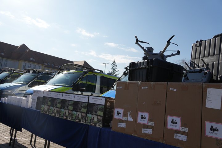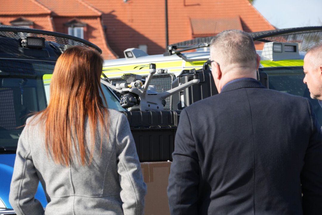 W poniedziałek (23 marca) dzięki porozumieniu, do policjantów z Warmii i Mazur trafiło 6 dronów DJI Matrice 4TD wraz z osprzętem, o łącznej wartości ponad 214 tys. zł. Zakupione BSP (bezzałogowe statki powietrzne) zostały zaprezentowane na terenie Oddziału Prewencji Policji w Olsztynie w obecności wojewody Radosława Króla, komendanta insp. Mirosława Elszkowskiego, I zastępcy komendanta insp. Jarosława Brzozowskiego oraz mł. insp. Marcina Romanowa, naczelnika wydziału zaopatrzenia KWP w Olsztynie.