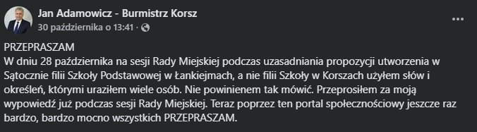 Dwa dni po sesji rady miejskiej Adamowicz zdecydował się na ponowne przeprosiny. Tym razem za pośrednictwem Facebooka. Burmistrz podkreślił, że nie powinien w ten sposób wypowiadać się o dzieciach.