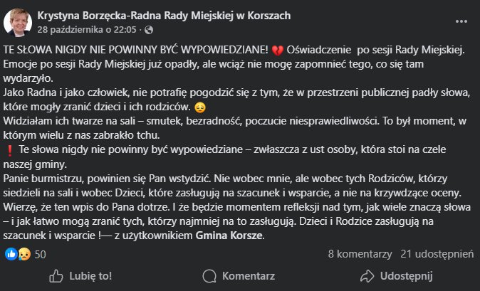 - Widziałam ich twarze na sali – smutek, bezradność, poczucie niesprawiedliwości. To był moment, w którym wielu z nas zabrakło tchu. Te słowa nigdy nie powinny być wypowiedziane – zwłaszcza z ust osoby, która stoi na czele naszej gminy. (…) Powinien się pan wstydzić. Nie wobec mnie, ale wobec tych rodziców, którzy siedzieli na sali i wobec dzieci, które zasługują na szacunek i wsparcie, a nie na krzywdzące oceny – uważa radna.