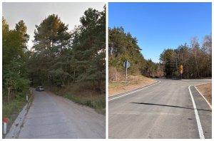 Zdjęcia „przed i po" pokazują skalę zmiany - z trudnej, wąskiej drogi gruntowej powstała nowoczesna, stabilna i bezpieczna trasa.