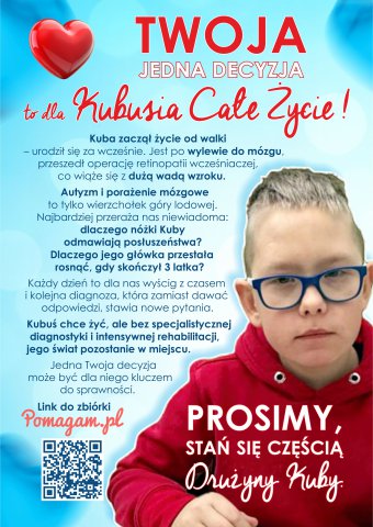 Jak podkreślają bliscy małego wojownika, Kubuś to niezwykle pogodne dziecko, którego oczy „błyszczą” na widok piłki. Chłopiec kocha ruch i odkrywanie świata, jednak jego ciało zaczyna stawiać opór. Coraz większe problemy z nogami w znacznym stopniu ograniczają jego samodzielność.