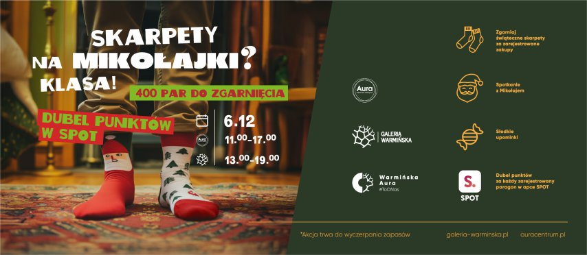 Tego dnia Warmińska Aura zaplanowała specjalną atrakcję, w której do wygrania będą skarpety z motywem świątecznym, idealne na spotkania klasowe, firmowe i rodzinne albo do poleżenia na kanapie. W tej akcji ważne będą zasady i szybka reakcja, bo inaczej ktoś inny może zgarnąć skarpety z limitowanej edycji. Nagrody wydawane będą do wyczerpania puli. Natomiast ważne będzie przestrzeganie zasad takich jak: