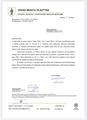 Odpowiedź z Wydziału Geodezji i Gospodarki Nieruchomościami Urzędu Miasta Olsztyna