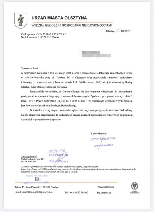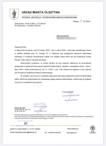 W odpowiedzi ratusza czytamy, iż „wskazana nieruchomość nie jest własnością gminy Olsztyn, tylko stanowi własność prywatną”. W sprawie podejrzenia samowoli budowlanej urzędnicy skierowali mieszkańców do powiatowego inspektoratu nadzoru budowlanego.