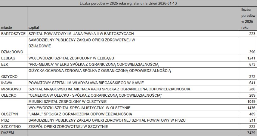 Łącznie na warmińsko-mazurskich oddziałach odebrano 7429 porody. Najwięcej, bo ok. 40 procent dzieci przyszło na świat w Olsztynie. W Wojewódzkim Szpitalu Specjalistycznym miało miejsce 1436 porodów, w Miejskim Szpitalu Zespolonym - 1049, a w Niepublicznym Zakładzie Opieki Zdrowotnej Malarkiewicz i Spółka – 489.