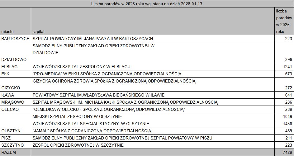 Na Warmii i Mazurach w ubiegłym roku oddziały położnicze funkcjonowały w 11 miastach. Poza Olsztynem, w którym dostępne były trzy porodówki, chodzi o: Bartoszyce, Działdowo, Elbląg, Ełk, Giżycko, Iławę, Mrągowo, Olecko, Pisz i Szczytno.