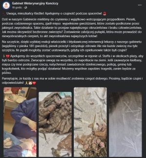 - Zwracajcie uwagę na wszystko, co napotkacie na ziemi. Jeśli zauważycie kiełbasy, mięsa czy inne podejrzane rzeczy, natychmiast zawiadomcie dzielnicowego, policję, gminę lub kogokolwiek, kto mógłby podjąć działania! Możemy wspólnie zapobiec tragedii, zanim będzie za późno. Pamiętajcie, że każdy z nas ma możliwość zrobienia czegoś dobrego. Prosimy, bądźcie czujni i odpowiedzialni! - podsumowali weterynarze.