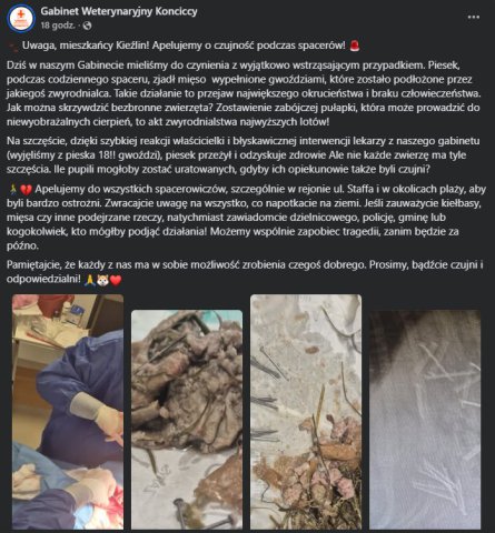 W miniony czwartek, 23 października, w Kieźlinach, doszło do niebezpiecznego zdarzenia. Ktoś rozrzucił na terenie miejscowości mięso wypełnione gwoździami. Jeden z psów zjadł przynętę podczas codziennego spaceru. Właścicielka czworonoga widząc, że dzieje się z nim coś niedobrego, zareagowała błyskawicznie, udając się z pupilem do miejscowego gabinetu weterynaryjnego „Koniccy”. Dzięki szybkiej reakcji lekarzy, psa udało się uratować.