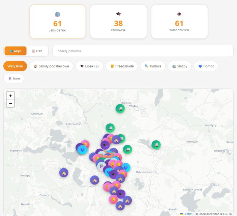 Moduł umożliwia wyszukiwanie konkretnej jednostki lub przeglądanie ich według kategorii: „Szkoły podstawowe”, „Licea i ZS”, „Przedszkola”, „Kultura”, „Służby”, „Pomoc”, „Inne”.