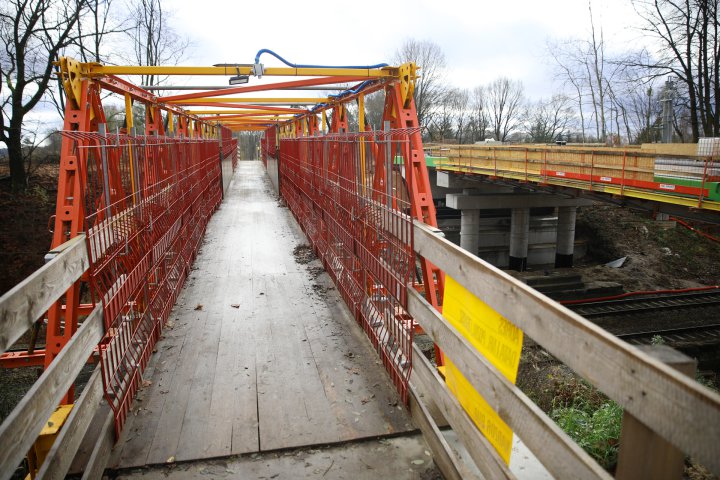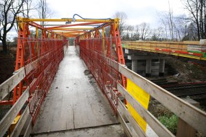 W maju br. pisaliśmy, że obok przebudowywanej konstrukcji postawiono tymczasową kładkę dla pieszych. Konstrukcja waży około 17 ton i ma niemal 30 metrów długości. Będzie służyć mieszkańcom do momentu ustawienia nowego mostu, co zaplanowano na pierwszy kwartał 2026 roku.