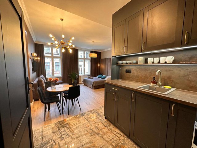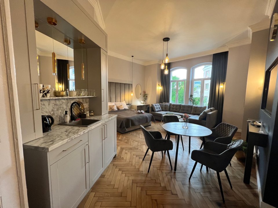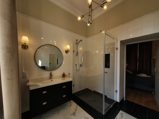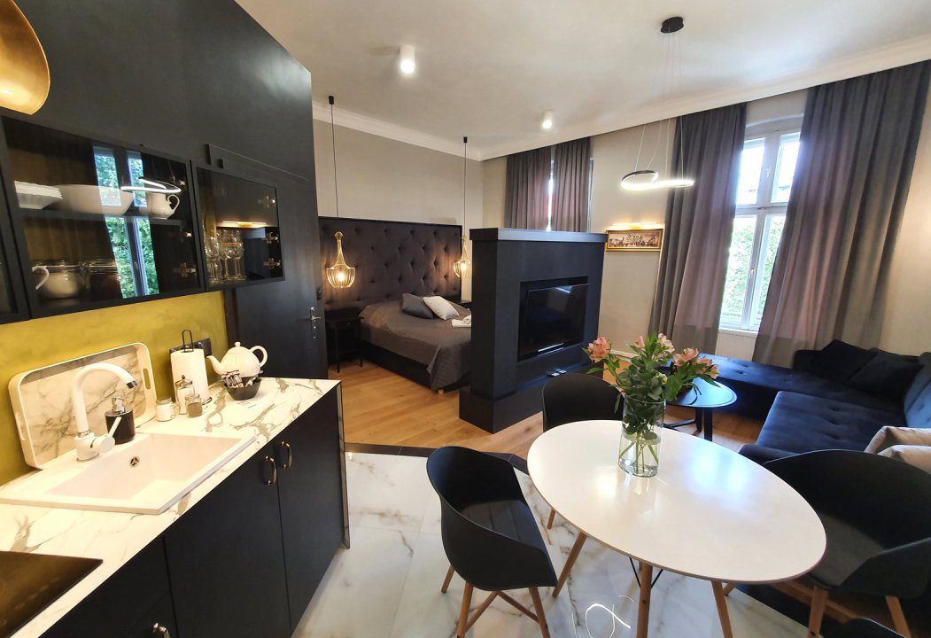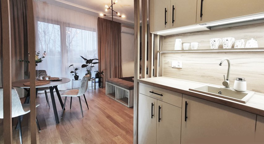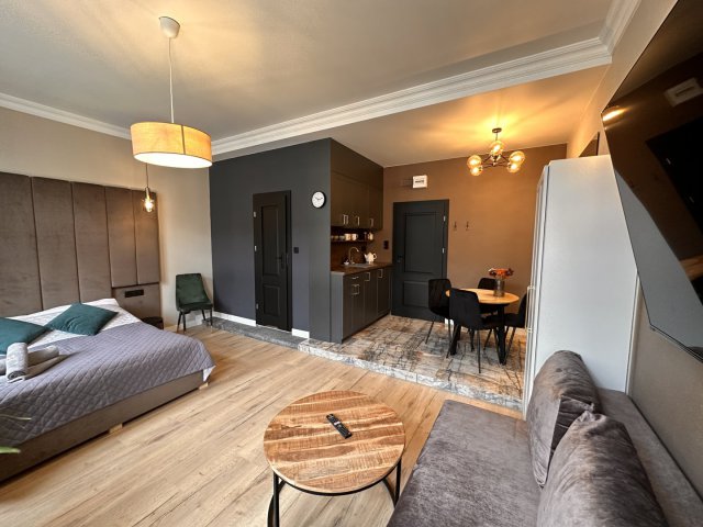 Jednocześnie zostawiamy gościom swobodę, której w hotelu często brakuje najbardziej. W apartamencie jest kuchnia z podstawowym wyposażeniem – nie po to, żeby organizować ucztę dla kilku osób, tylko po to, żeby normalnie funkcjonować: ciepłe śniadanie, szybki posiłek po pracy, coś prostego wieczorem, herbata, kawa. W swoim tempie, bez schodzenia do restauracji i bez patrzenia na godziny.