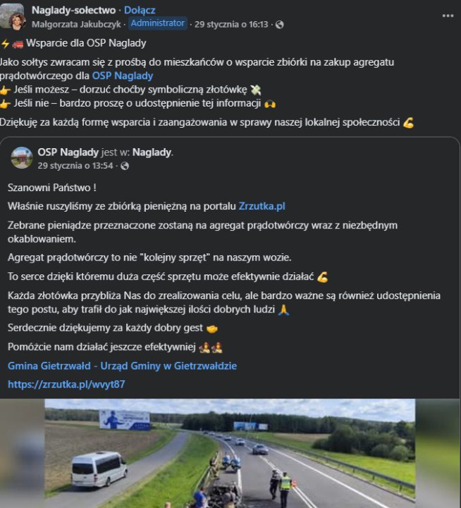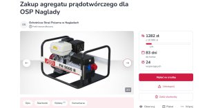 - Zwracam się z prośbą do mieszkańców o wsparcie zbiórki na zakup agregatu prądotwórczego dla OSP Naglady. Jeśli możesz – dorzuć choćby symboliczną złotówkę. Jeśli nie – proszę o udostępnienie tej informacji – napisała na facebookowym profilu "Naglady-sołectwo" Jakubczyk.