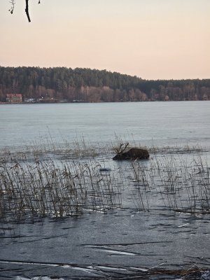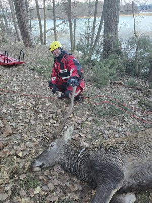 Z relacji OSP w Pluskach wynika, że straż przetransportowała za pomocą sań lodowych weterynarza do zwierzęcia (pierwsze 20 m jeziora było już rozmarznięte). Następnie, jeleniowi podano dawkę środku usypiającego, co pozwoliło przesunąć (za pomocą liny przyczepionej do poroża) zwierzę na brzeg. Potem, jeleń został przetransportowany przy asyście 6 strażaków na skarpę - z dala od jeziora.