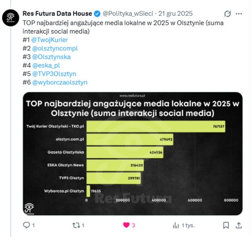 Według danych Similarweb za listopad 2025 roku, Olsztyn24.com miał zaledwie ok. 3,1 tys. wizyt miesięcznie. To... 215 razy mniej niż portal Olsztyn.com.pl (667,755). Przy okazji warto dodać, że kolejny miesiąc z rzędu wyprzedziliśmy także Gazetę Olsztyńską (652,165).