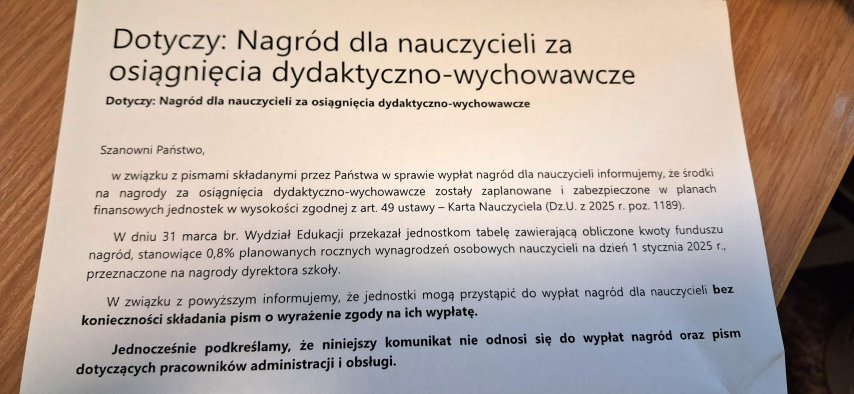 W ostatnim czasie na naszą redakcyjną skrzynkę trafił inny komunikat ratusza. Chodzi o wytyczne dla szkół ws. nagród dla nauczycieli „za osiągnięcia dydaktyczno-wychowawcze”. Wynika z nich, że pieniądze będą wypłacane nauczycielom bez konieczności składania stosownego wniosku. Taka automatyczna wypłata nie dotyczy natomiast pracowników administracji i obsługi.
