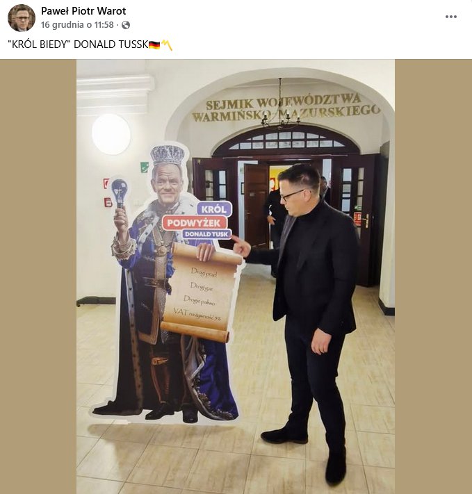 - „Król biedy” Donald Tussk - opisał swoje zdjęcie z podobizną premiera radny Paweł Warot. - D. Tusk. Król drożyzny w Polsce – skomentował z kolei Piotr Soćko. Obaj radni PiS dodali do swoich wpisów w mediach społecznościowych niemiecką flagę przy nazwisku szefa rządu.