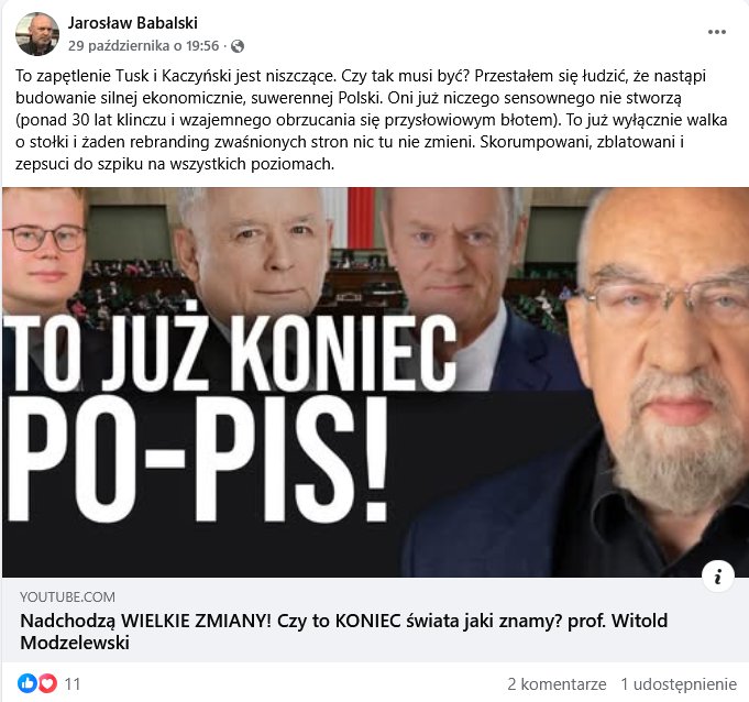 - To zapętlenie Tusk i Kaczyński jest niszczące. Czy tak musi być? Przestałem się łudzić, że nastąpi budowanie silnej ekonomicznie, suwerennej Polski. Oni już niczego sensownego nie stworzą (ponad 30 lat klinczu i wzajemnego obrzucania się przysłowiowym błotem). To już wyłącznie walka o stołki i żaden rebranding zwaśnionych stron nic tu nie zmieni. Skorumpowani, zblatowani i zepsuci do szpiku na wszystkich poziomach