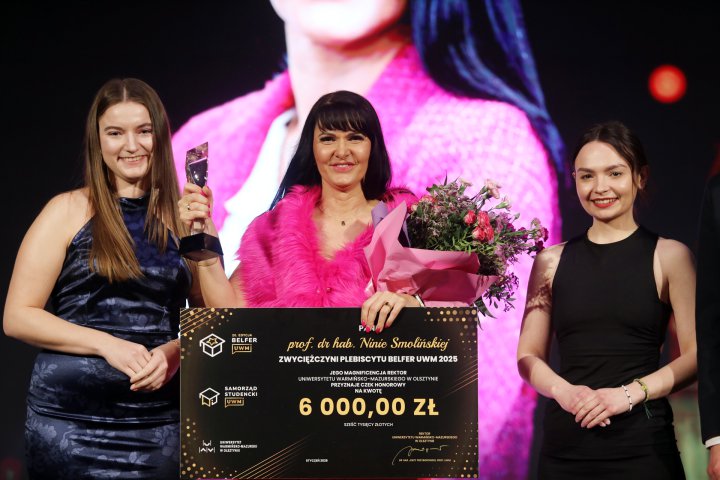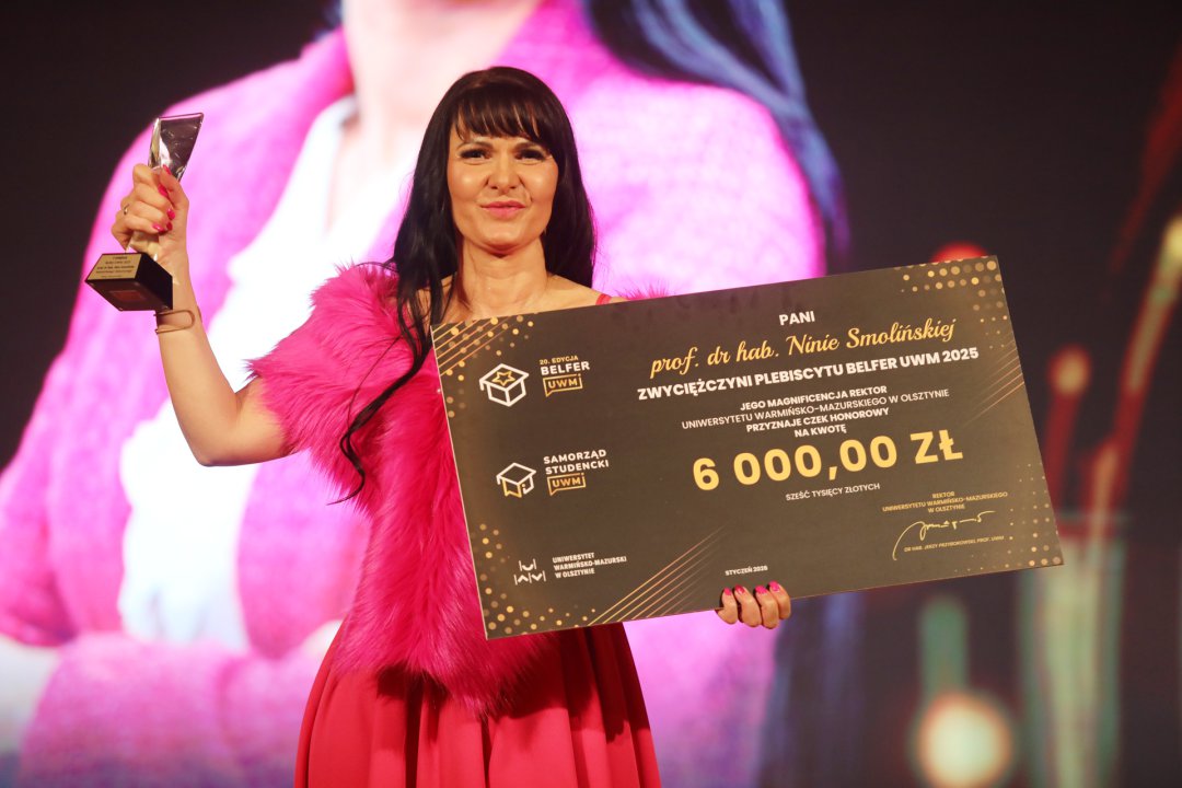 Po tytuł Belfra UWM 2025 sięgnęła prof. dr hab. Nina Smolińska z Wydziału Biologii i Biotechnologii. Decyzja spotkała się z niezwykle entuzjastycznym przyjęciem zgromadzonej widowni. Warto wspomnieć, że kampania promująca nauczycielkę przygotowana została w bardzo kreatywny sposób. Była pełna... różu i wdzięku. Wideo zamieszczamy na dole artykułu. Smolińska otrzymała czek honorowy przyznany przez rektora UWM prof. Jerzego Przyborowskiego, w wysokości 6000 zł.