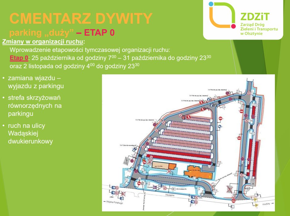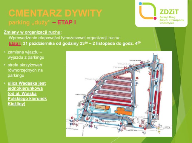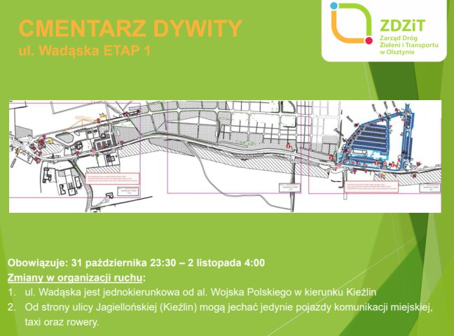 Kierowcy jadący w kierunku pierwszej z wymienionych nekropolii muszą mieć na uwadze, iż już w nocy z piątku na sobotę (31 października, od około 23:30) ul. Wadąska, od skrzyżowania z al. Wojska Polskiego do wysokości dużego parkingu, zlokalizowanego przy cmentarzu, będzie trasą jednokierunkową. Co ważne, dojazd na parkingi znajdujące się przy cmentarzu „Dywity” możliwy będzie jedynie od al. Wojska Polskiego.