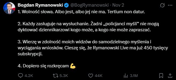 Bogdan Rymanowski odniósł się do krytyki na platformie X, stwierdzając, że "każdy zasługuje na wysłuchanie" i "wierzy w zdolność jego widzów do samodzielnego myślenia i wyciągania wniosków".