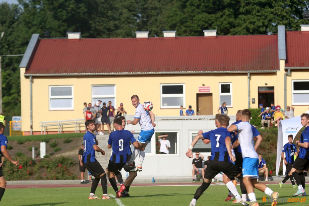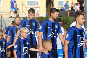 Trener Piotr Gurzęda w porównaniu z poprzednim meczem - przegranym 2:3 z Concordią Elbląg - wprowadził dwie zmiany wyjściowej jedenastce. Na boisku od początku zobaczyliśmy Pawła Wiśniewskiego oraz Mateusza Pajdaka. Pierwszą bramkę w meczu strzelili gospodarze. DKS Dobre Miasto wyszedł na prowadzenie za sprawą Konrada Gawrysia w 13. minucie meczu. Do wyrównania po indywidualnej akcji doprowadził Marcin Fiedorowicz w 27. minucie meczu. Bramkę na 2:1 z rzutu karnego strzelił Piotr Łysiak w ostatniej minucie pierwszej połowy. Chwilę wcześniej faulowany był Fiedorowicz.