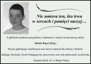 Kadra Zespołu Szkół nr 1 w Białej Piskiej, do której uczęszczał Jakub, zapamiętała go jako chłopaka życzliwego, serdecznego, uśmiechniętego i pełnego pasji.