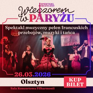 „Wieczorem w Paryżu” to spotkanie z kulturą, która fascynuje i inspiruje. To spektakl, który pozwala na chwilę oderwać się od codzienności i zanurzyć w świecie pełnym muzyki, emocji i niepowtarzalnego klimatu.