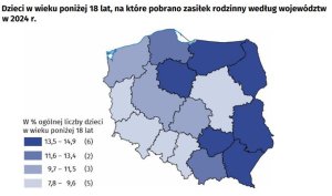 Udział dzieci w wieku poniżej 18 lat, na które rodzice pobrali zasiłki rodzinne w ogólnej liczbie dzieci w tym wieku wynosił 10,9% i był niższy o 3,0 p. proc. w porównaniu z 2023 r. Wskaźnik ten najwyższą wartość osiągnął w województwie warmińsko-mazurskim (14,9%), a najniższą w województwie dolnośląskim (7,8%). W sumie na Warmii i Mazurach w ramach świadczeń rodzinnych wypłacono 642 mln zł.