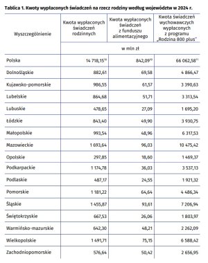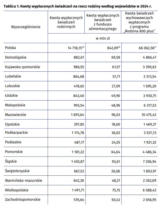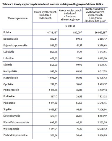 Oddzielnie traktowane jest świadczenie 800 plus. W 2024 r. wydatki na ten program wyniosły 66,19 mld zł - miesięcznie średnio wypłacano 6,8 mln świadczeń. W naszym regionie w ramach 800 plus wypłacono 2,2 mld zł. Przypomnijmy, że świadczenie wychowawcze od 1 stycznia 2024 r. zostało podniesione z 500 zł.