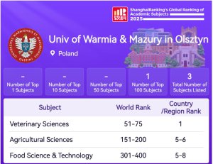 Kolejną dyscypliną, która została odnotowana w GRAS 2025, jest technologia żywności i żywienia. Uniwersytet Warmińsko-Mazurski w Olsztynie został sklasyfikowany tu w przedziale 301-400. Na liście znalazło się jeszcze siedem innych polskich uczelni. Miejsca na czele rankingu przypadły tu ponownie trzem chińskim uczelniom: Jiangnan University, South China University of Technology oraz Zhejiang University.