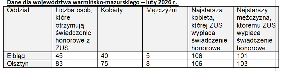 W całym kraju na koniec września 2025 r. liczba osób otrzymujących świadczenie honorowe z ZUS wynosiła 3 863, a już na koniec grudnia 2025 r. – 4057. Wzrost ten nastąpił także w województwie warmińsko-mazurskim. We wrześniu ubiegłego roku oddziały ZUS na Warmii i Mazurach wypłacały 102 świadczenia honorowe, a w lutym tego roku liczba ta wzrosła i świadczenie honorowe wypłacane jest już 138 osobom. Najwięcej świadczeń honorowych wypłacanych jest w województwie mazowieckim – na koniec grudnia 2025 - 693.