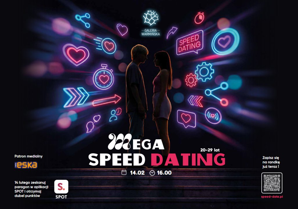 14 lutego, w sobotę, na terenie atrium, w udekorowanej w walentynkowym klimacie strefie, dla odważnych, zostanie przygotowana przestrzeń do szybkich, kilkuminutowych spotkań zapoznawczych jeden na jeden z osobami, które zgłoszą się do udziału w wydarzeniu. Obowiązują zapisy pod linkiem: https://speed-dates.pl/randka/%E2%9D%A4%EF%B8%8Fwalentynkowy-speed-dating-w-galerii-warminskiej-olsztyn-randkuje-randkowa-sobota-grupa-20-29-lat-14-02-2026-darmowe-zapisy/