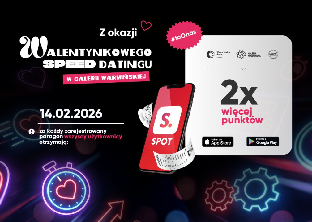 Poza wielkim randkowaniem, 14 lutego na wszystkich klientów, zarówno w Galerii Warmińskiej, jak i w Aurze Centrum Olsztyna, będą czekały specjalne oferty i rabaty oraz dubel punktów w darmowej aplikacji SPOT za zakupy. Bezpłatną aplikację lojalnościową SPOT obu centrów handlowych można pobrać ze sklepów Google Play (Android 7.0+) lub App Store (iOS 10.0+). Wystarczy wyszukać „SPOT” w sklepie na telefonie, zainstalować ją, wybrać Galerię Warmińską lub Aurę Centrum Olsztyna i zarejestrować się, aby uzyskać dostęp do zniżek, nawigacji po centrum oraz ofert specjalnych.