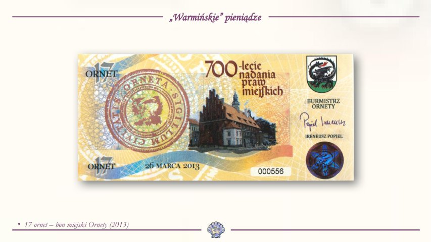 Z kolei w 2013 roku wyprodukowano banknot z okazji 700-lecia nadania praw miejskich Ornecie o nominale "17 ornet".