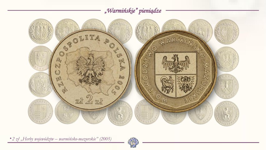 Warmia i Mazury pojawiły się na pieniądzu z serii "Herby Województw" po reformie administracyjnej. Monety były emitowane co miesiąc w kolejności alfabetycznej nazw województw, a warmińsko-mazurskie przypadło na luty 2005 roku.