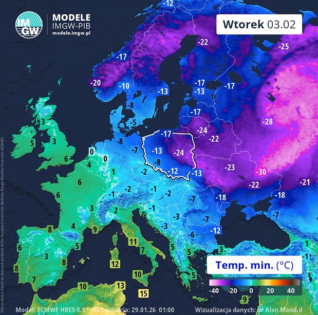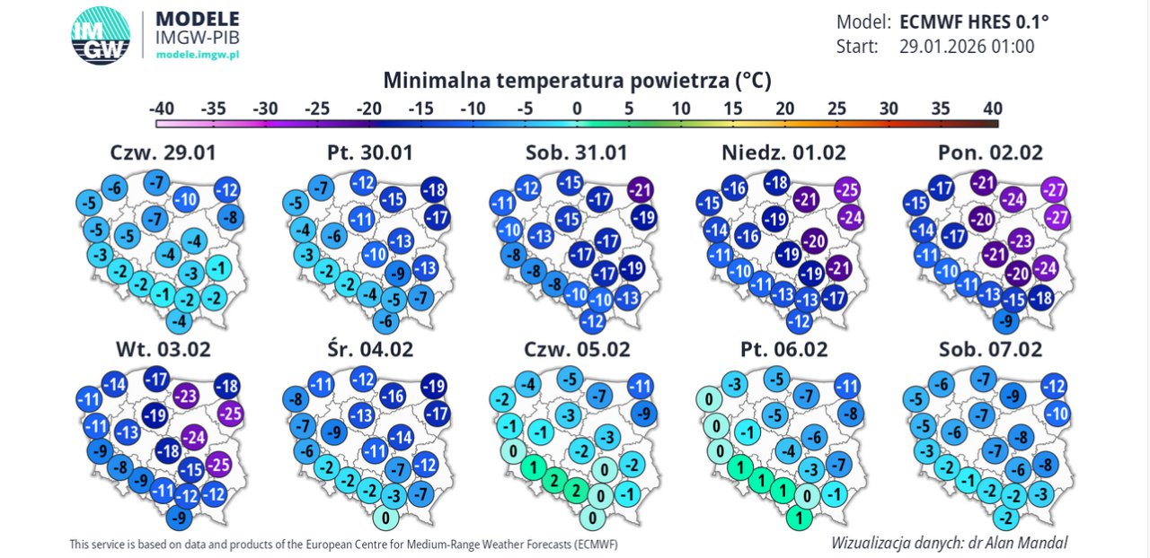 Według synoptyków pierwszy raz mróz może osiągnąć ponad 20 stopni poniżej zera już w sobotę (31 stycznia), kiedy w okolicach Gołdapi i Olecka termometry pokażą -21°C. W niedzielę ma być jeszcze zimniej, bo -25°C. Nowy tydzień przywita mieszkańców regionów na styku Podlasia oraz Warmii i Mazur nawet -27°C. W Olsztynie ma być niewiele cieplej, bo -24°C. Będzie zimno, ale bez opadów. Śnieg ma powrócić w środę (4 lutego).