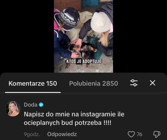 Dzięki zebranym środkom, do przytuliska trafiło do tej pory 100 kg karmy. Zostały także zamówione np. materiały do ocieplania czy kurteczki dla zwierząt. Co ciekawe, do Pauliny Kucińskiej odezwała się także piosenkarka, Doda z chęcią zakupienia bud – 2 w rozmiarze L i 3 w rozmiarze M.